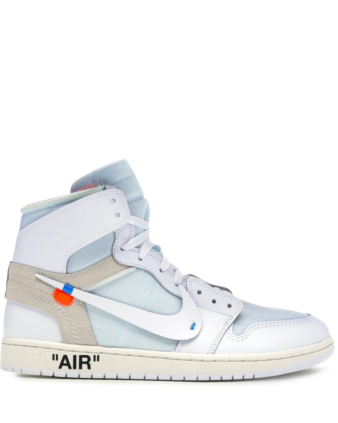 The Air Jordan 1 Retro High Off-White NRG is a highly coveted collaboration between Nike and Virgil Abloh's Off-White brand. The sneaker features a distressed, deconstructed look, with a mix of premium leather and suede on the upper. It comes in a white and cream colorway, accented with signature Off-White details like the zip tie, bold text, and cut-out Swoosh. The shoe also includes exposed stitching and industrial design elements that give it a unique, unfinished aesthetic. The Air Jordan 1's classic high-top silhouette is complemented by a cushioned midsole for comfort and a rubber outsole for traction. This collaboration blends luxury fashion with streetwear, making it a must-have for sneakerheads and Off-White fans.