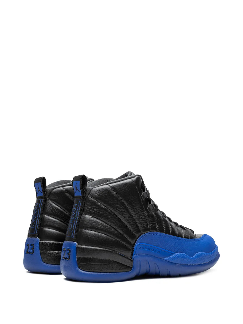 The Air Jordan 12 "Royal" (also known as the "Game Royal") features a sleek design with a black tumbled leather upper and Game Royal suede overlays. Released on September 21, 2021, this sneaker pays homage to the iconic "Flu Game" colorway, offering a modern twist with its bold blue accents. It combines classic style with contemporary materials, making it a standout addition to any collection.