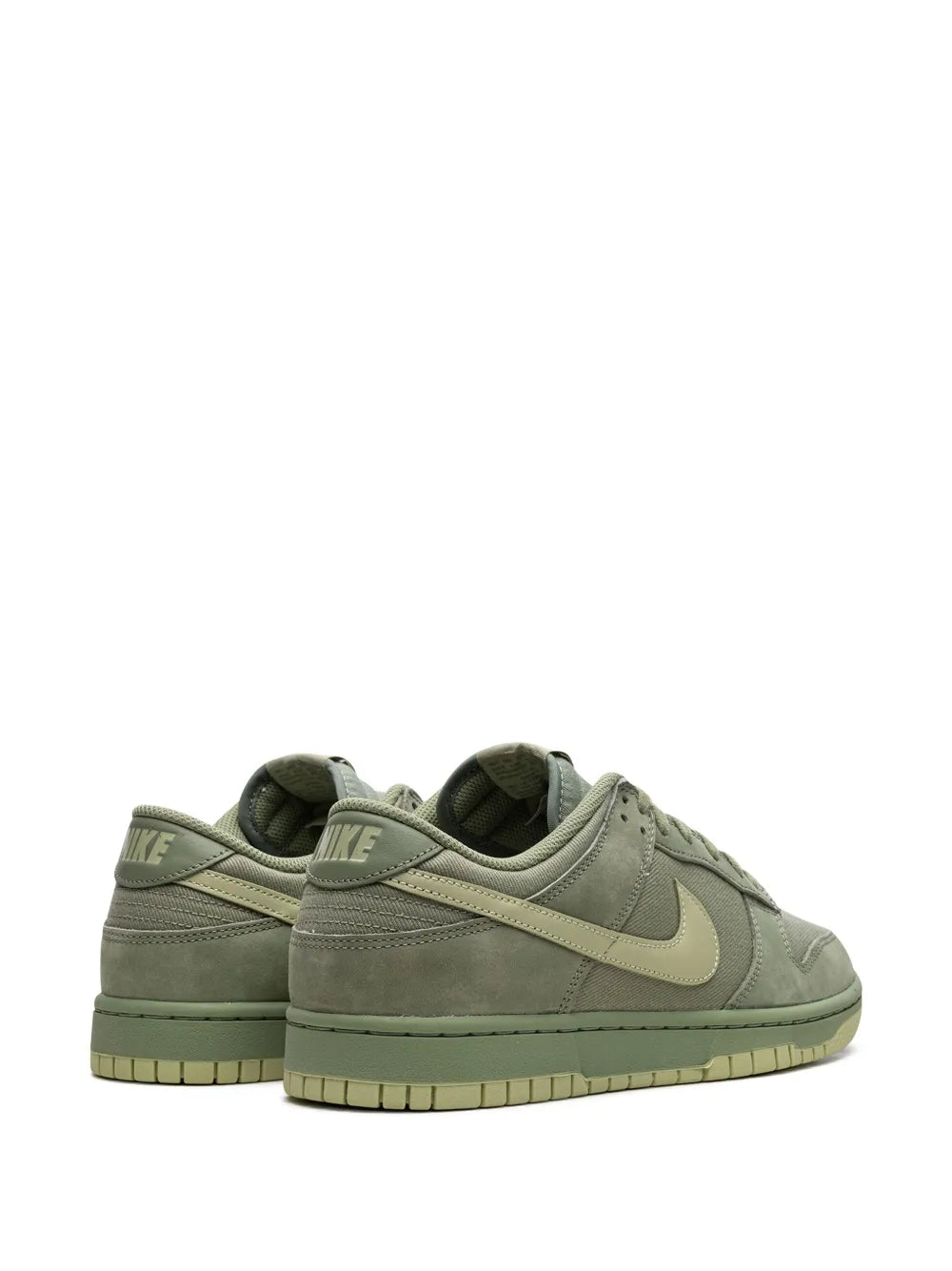 The Dunk Low "Oil Green" by Nike features a robust combination of materials, including suede, denim, and canvas twill, all in a delightful pistachio-like green hue. The iconic Swoosh logo is prominently displayed on the sides, while Nike branding adorns the tongue and heel.