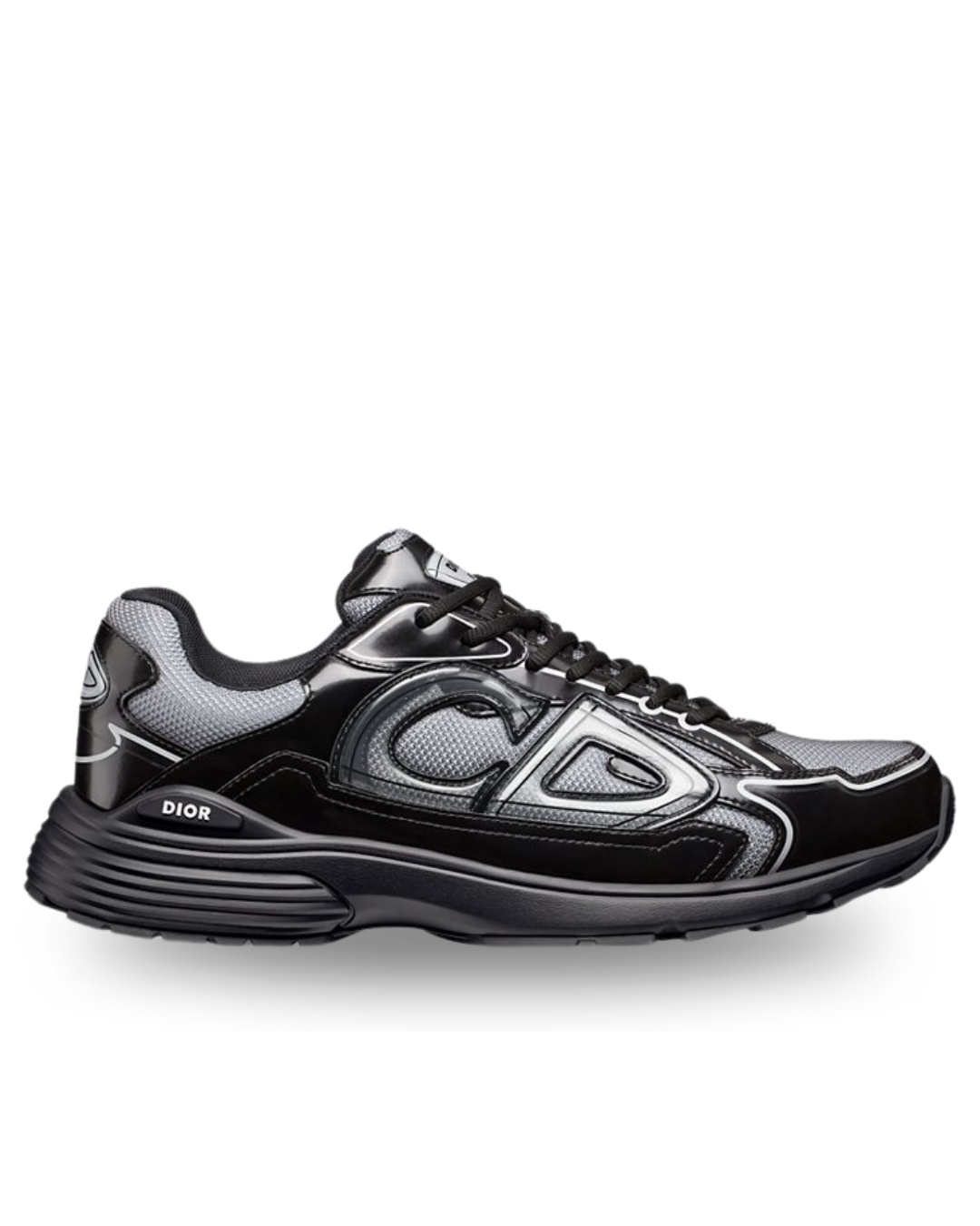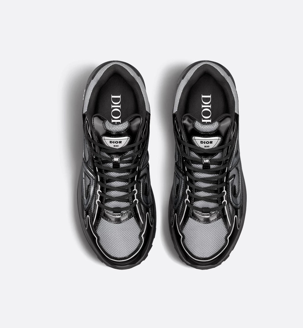 The Dior B30 Countdown Sneaker features a technical mesh and calfskin leather lining, combining breathability with luxury comfort. Its sporty yet sophisticated design is enhanced by the reflective CD30 signature, ultra-light sculpted rubber sole, and sleek Dior branding. Perfect for effortless casual styling with a modern edge.