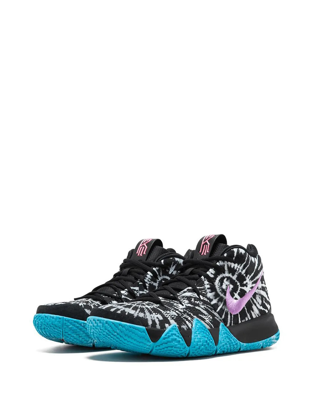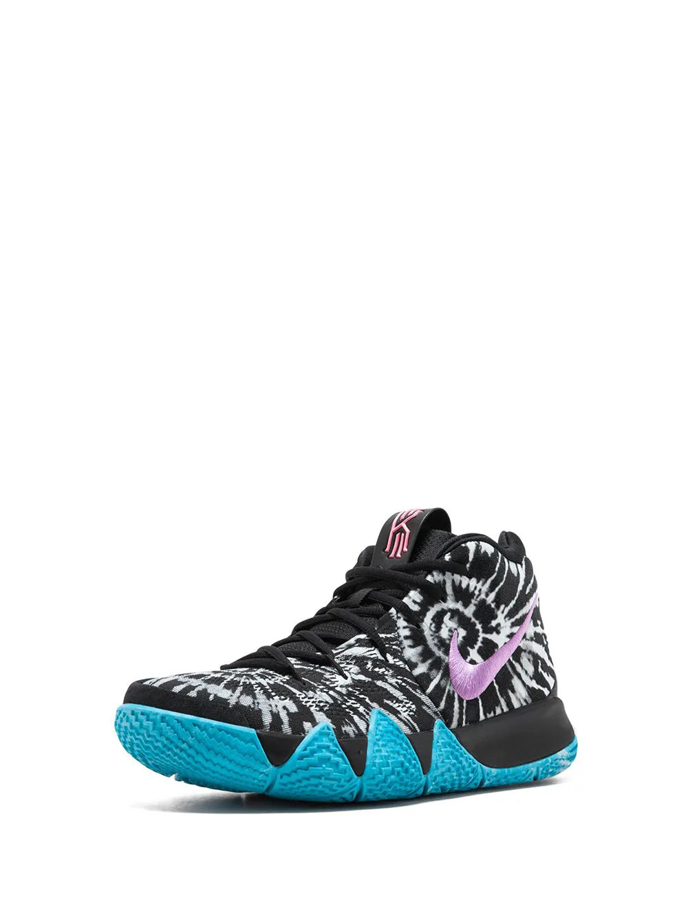 The Nike Kyrie 4 "All-Star" features a bold black and white tie-dye upper, purple Swoosh, aqua blue outsole, and pink Kyrie logo on the tongue. Inspired by Venice Beach, it blends street style with top performance.